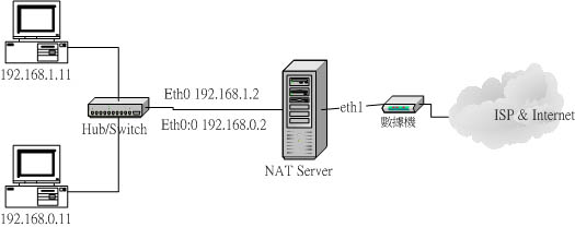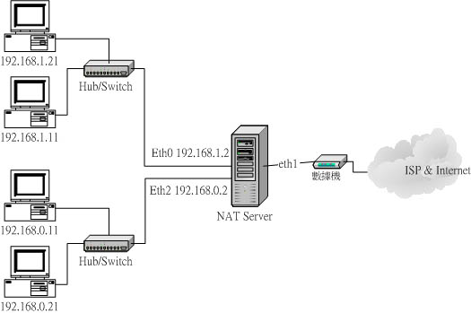 1. Linux 主機:我的 Linux 伺服器本身未來亦作為 NAT 之用,裡面有兩張網路卡,一張連接 ADSL 數據機,這張對外卡的代號為 eth1 ,一張連接內部網路,代號為 eth0 ;