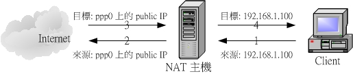 - 對於 Client 端來說,由於已經經過了 IP 偽裝的功能,所以基本上,您通過 NAT 主機連出去的封包的 IP 都會是『 NAT 主機對外的公共 IP 』,因此對於內部 Client 端而言,由於網路 Cracker 幾乎都是根據 IP 來進行破壞,而因為您連出去的封包 IP 是 NAT 主機的公共 IP ,自然您的 Client 端就比較安全多了!基本上, Client 端在 NAT 之內,沒有安裝防火牆軟體也還好,但是『防毒軟體一定要安裝!』因為您畢竟會接收電子郵件呀等等的,所以還是可能會中毒啦!!